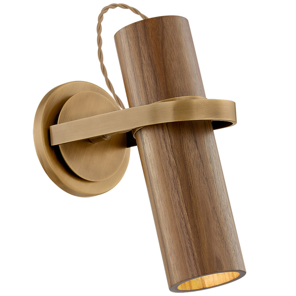 Crafted from walnut wood and Patina Brass, this spotlight sconce combines functional articulation with a natural, handcrafted feel. Its slim, cylindrical head pivots within the U-shaped cuff, which itself rotates at the backplate to provide a complete range of motion. The elevated mix of materials demonstrates that peak utility doesn't confine aesthetics.