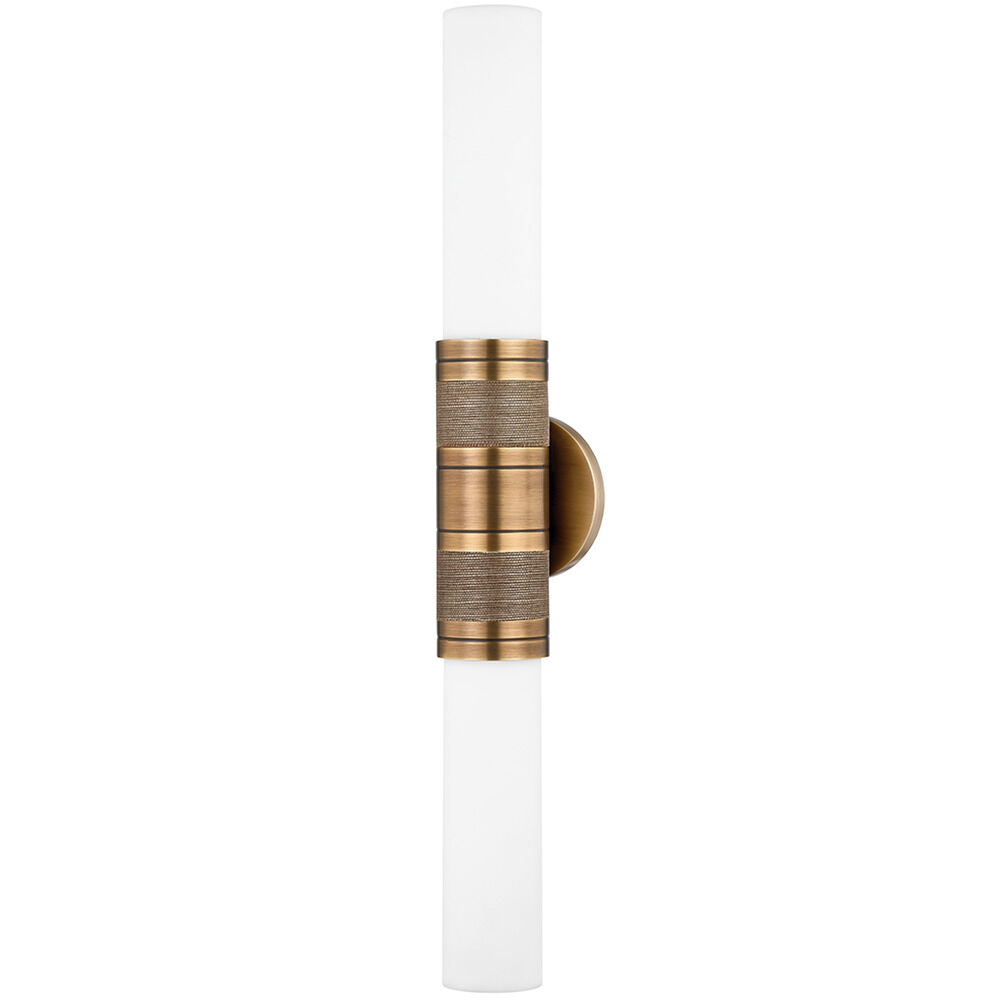 Detailed metalwork and unique natural materials make this familiar sconce silhouette feel fresh. An opal matte glass tube sconce is banded at the middle in layers of machine-detailed Patina Brass and grass cloth, giving it a soft organic look with a clean modern edge. Liam works well solo or in multiples and can be mounted horizontally or vertically.