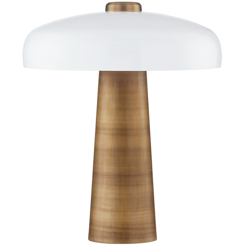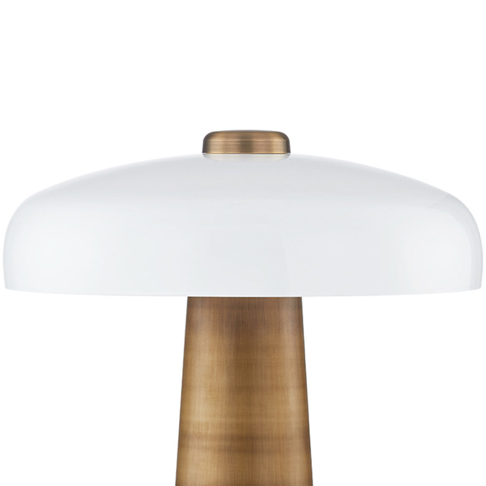 Lush takes the mushroom-shaped table lamp trend and makes it feel special using an unexpected mix of materials. An opal glossy glass shade caps a stem-shaped Patina Brass base. The glass shade gives the fixture a contemporary feel, while the metal finish adds to the earthy, artisanal vibe. This lamp will add a warm, modern style and a gorgeous glow to any tabletop.