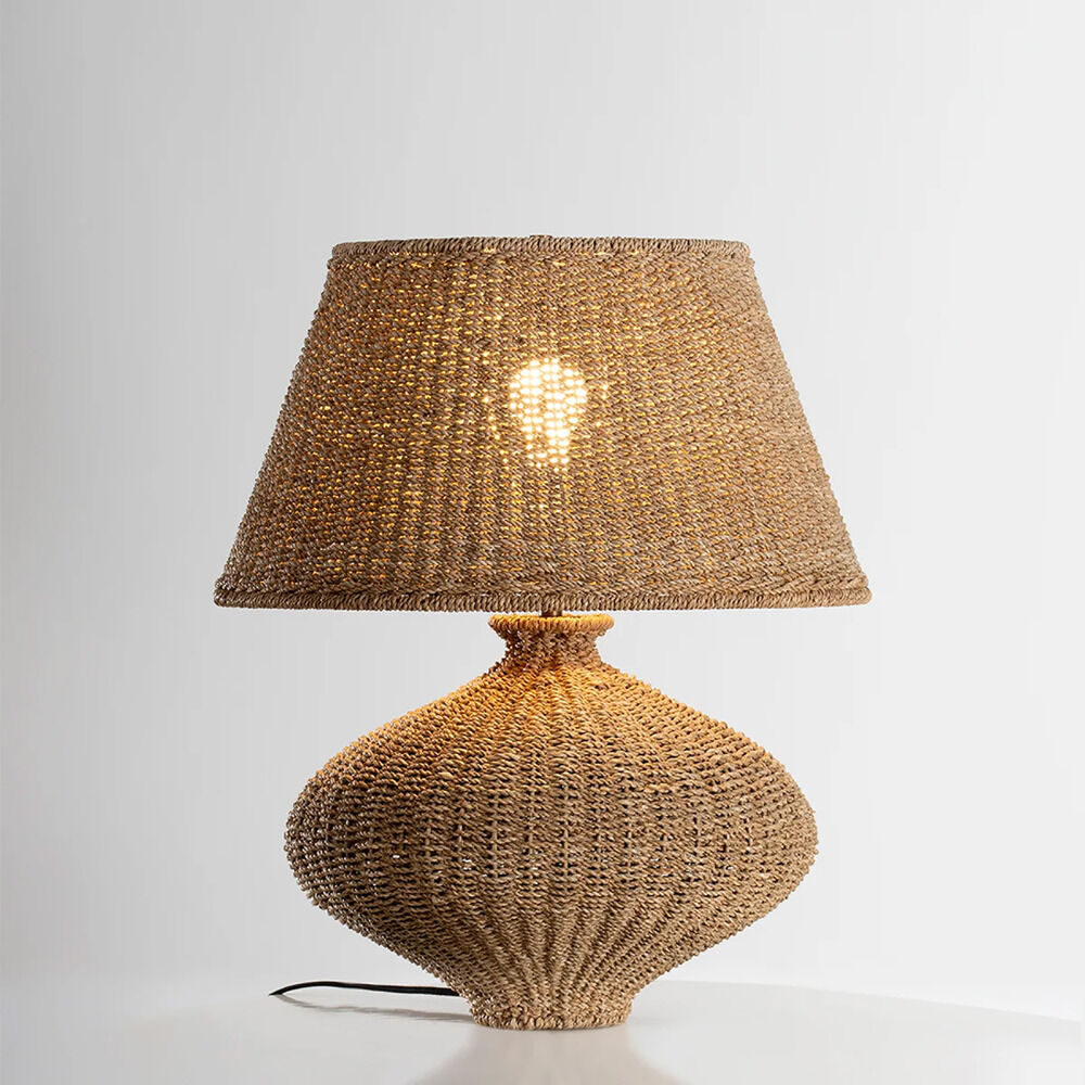 Celebrating the beauty of imperfection, the sculptural Nette lamp features an asymmetrical body and tapered shade in all-over natural woven Abaca. The shapely silhouette gives Nette a rustic presence, while the Patina Brass finish adds to the warm aura surrounding the piece. Place Nette on a console, desk, or end table for an instant dose of artistry. Part of our Loft and Thought collection. Due to the one-of-a-kind nature of the medium, exact colors and patterns may vary slightly from the image shown.