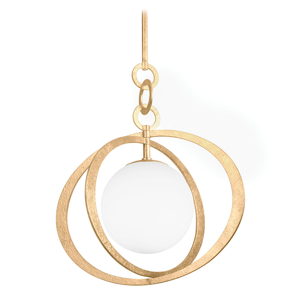 A single opal glossy globe is orbited by a pair of intersecting spheres making a graphic, modern statement. The thin flat metalwork combined with the texture of the Black Iron or Vintage Gold Leaf finish create a sense of movement and visual interest.