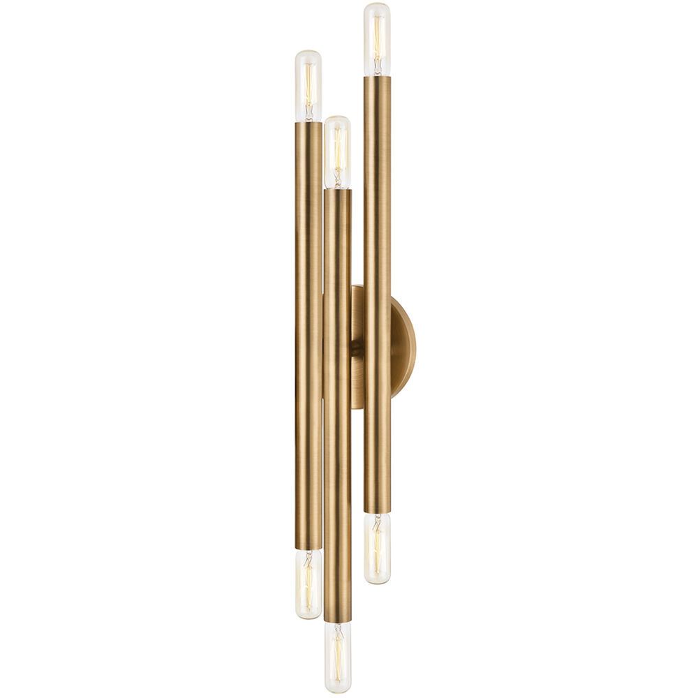 Streamlined, cylindrical metal shades are mounted at varying heights and depths from a circular backplate for a sleek and minimalist take on a mid-century modern silhouette. The variety of finishes (Patina Brass, Bronze and Polished Nickel) complement any interior, with the Polished Nickel working particularly well in a powder room or bath. This versatile six-light wall sconce can be styled horizontally or vertically.