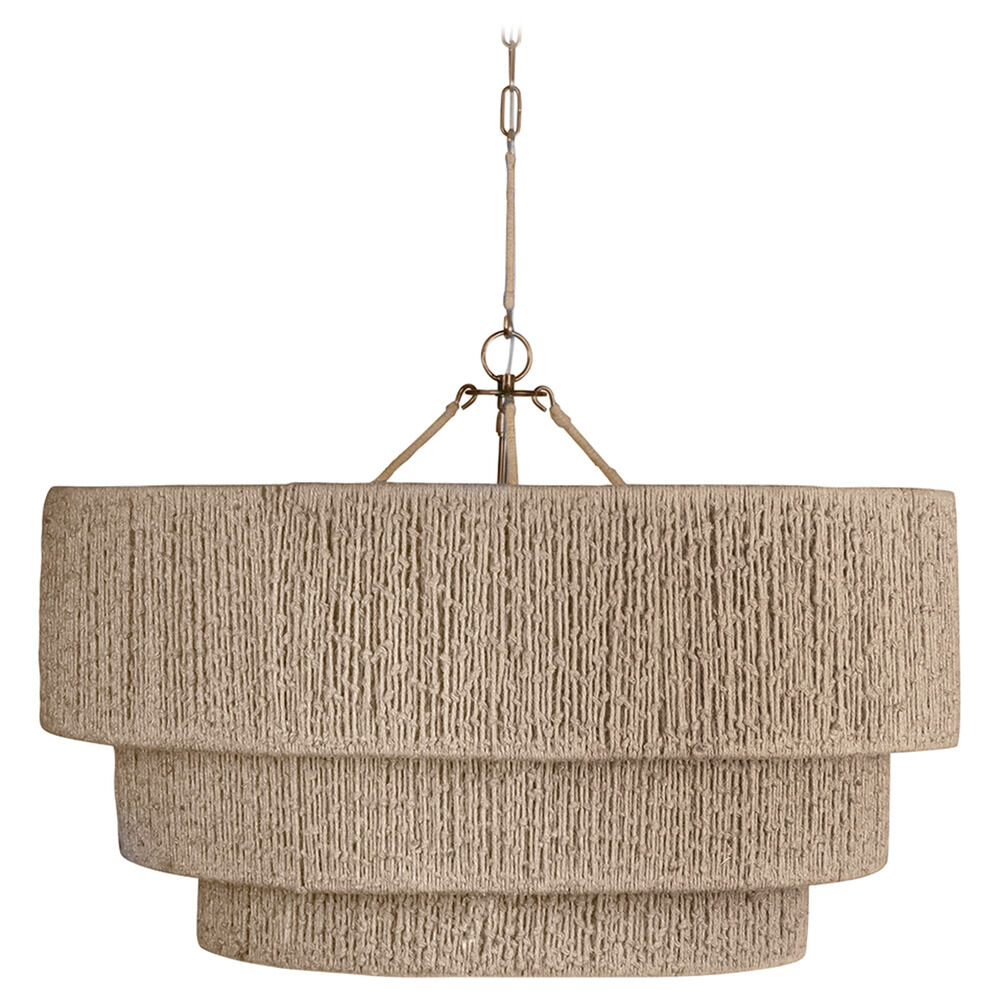 The familiar silhouette of a drum shade is magnified and multiplied in the Reza chandelier. Made from wrapped jute string, with an added layer of knotting that creates allover texture, the cascading shades feature a rich materiality and authentic handicraft that is carried through to the three string suspension cords. The antiqued Patina Brass finish of the metalwork blends neatly with the earthy palette. Due to the one-of-a-kind nature of the medium, exact colors and patterns may vary slightly from the image shown.