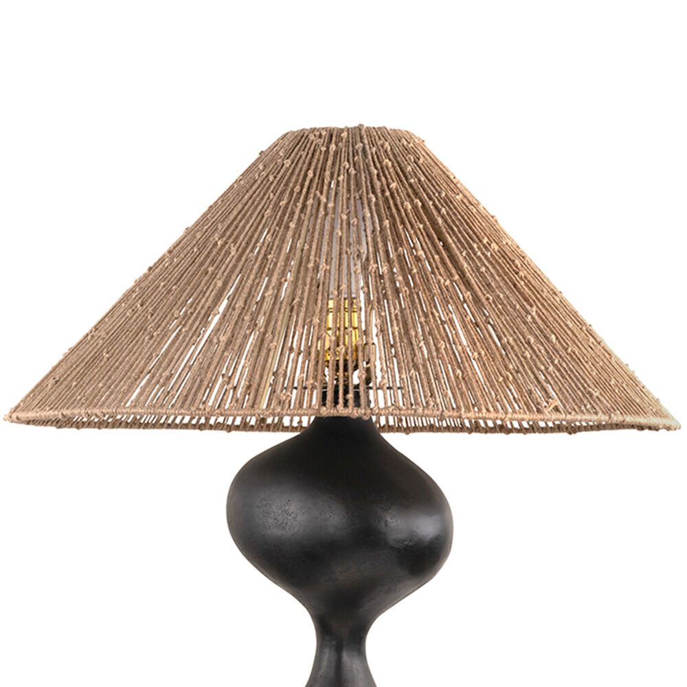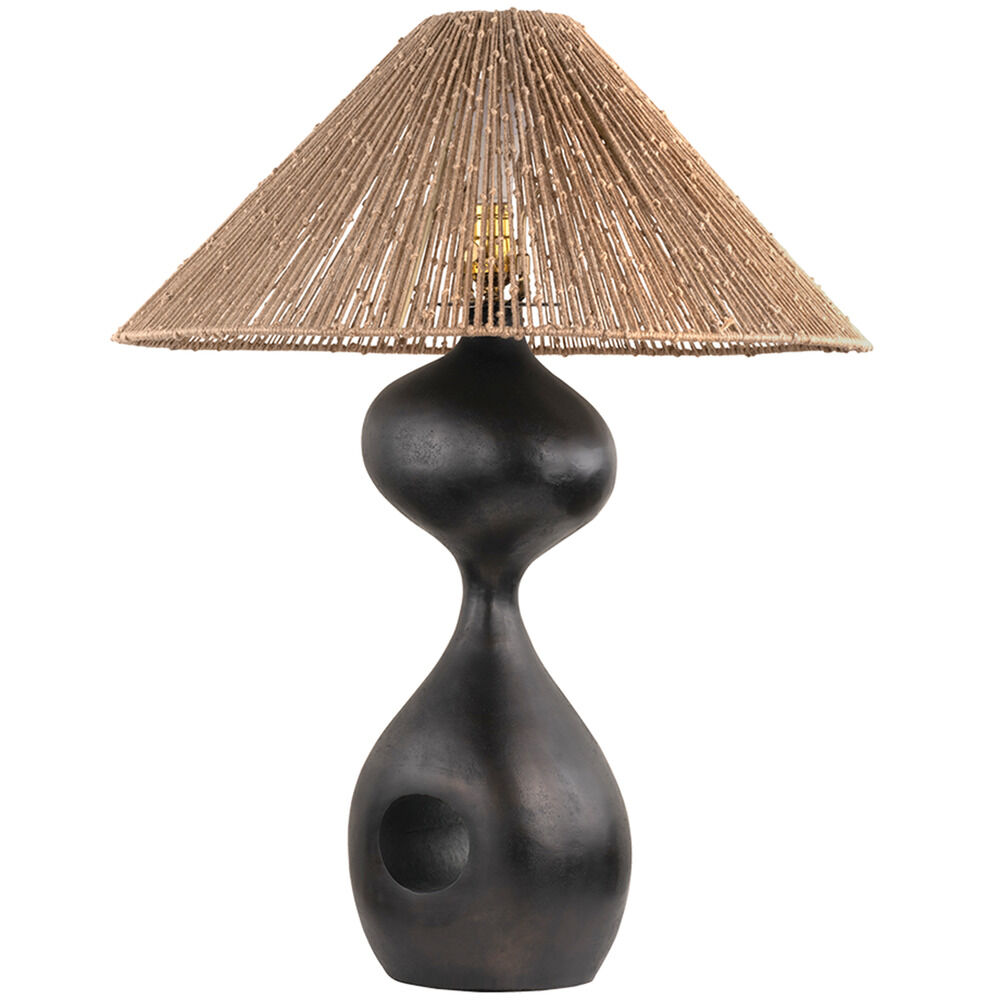 Referencing ancient stone relics slowly shaped by nature over time, the Rhu table lamp is simultaneously rough and sophisticated. The sand-cast metal possesses a stone-like appearance with a light-reflecting texture. Creating an unexpected focal point, a perfectly concentric cut-out highlights negative space within the voluptuous form. A shade made from knotted jute completes the composition with a note of earthy lightness. Part of our Chandler McLellan collection.