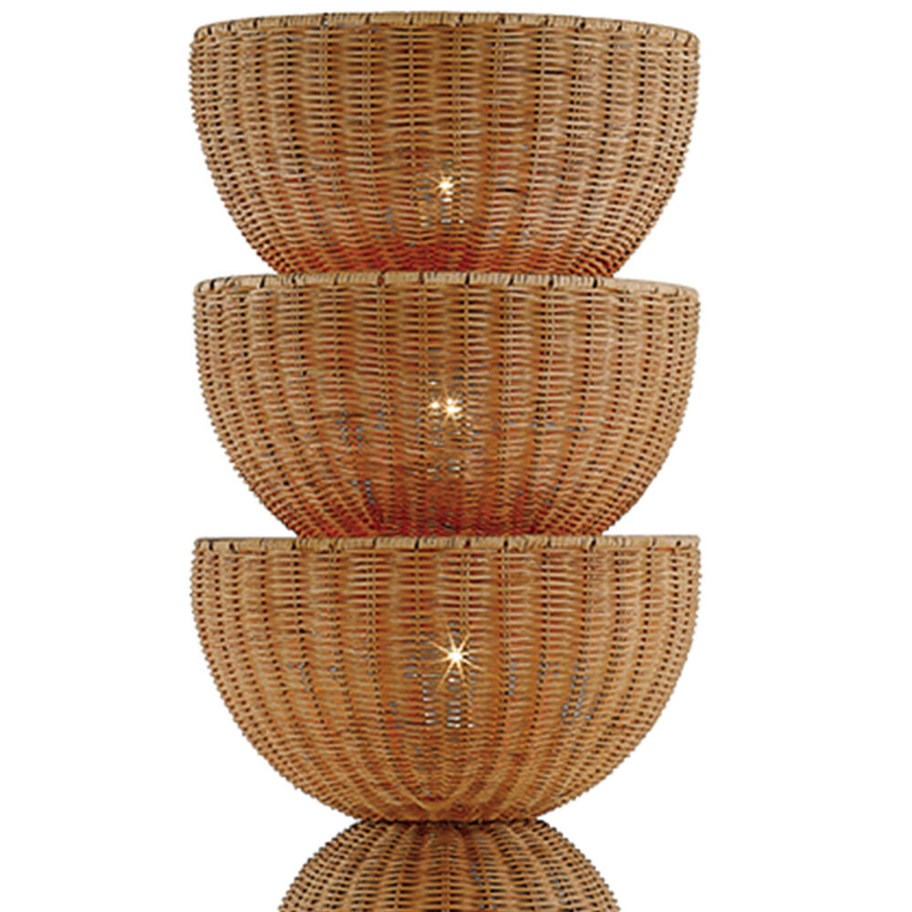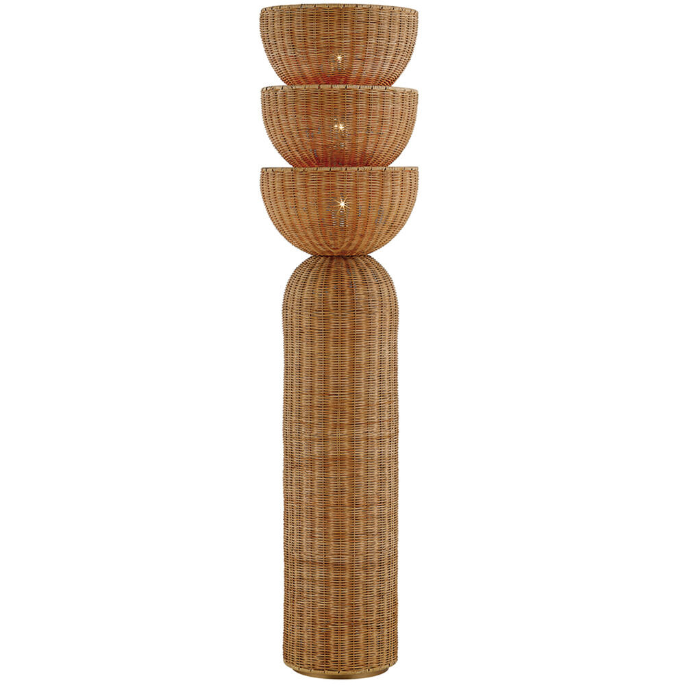 Repetitive geometric shapes drawn from mid-century motifs create an eye-catching totemic stack in the Rian floor lamp. Each natural wicker bowl is individually lit, allowing a soft diffusion of light through the textural weave. With an impressive height of 55 inches, this 3-light floor lamp makes for a striking sculptural addition to any room. Due to the one-of-a-kind nature of the medium, exact colors and patterns may vary slightly from the image shown.