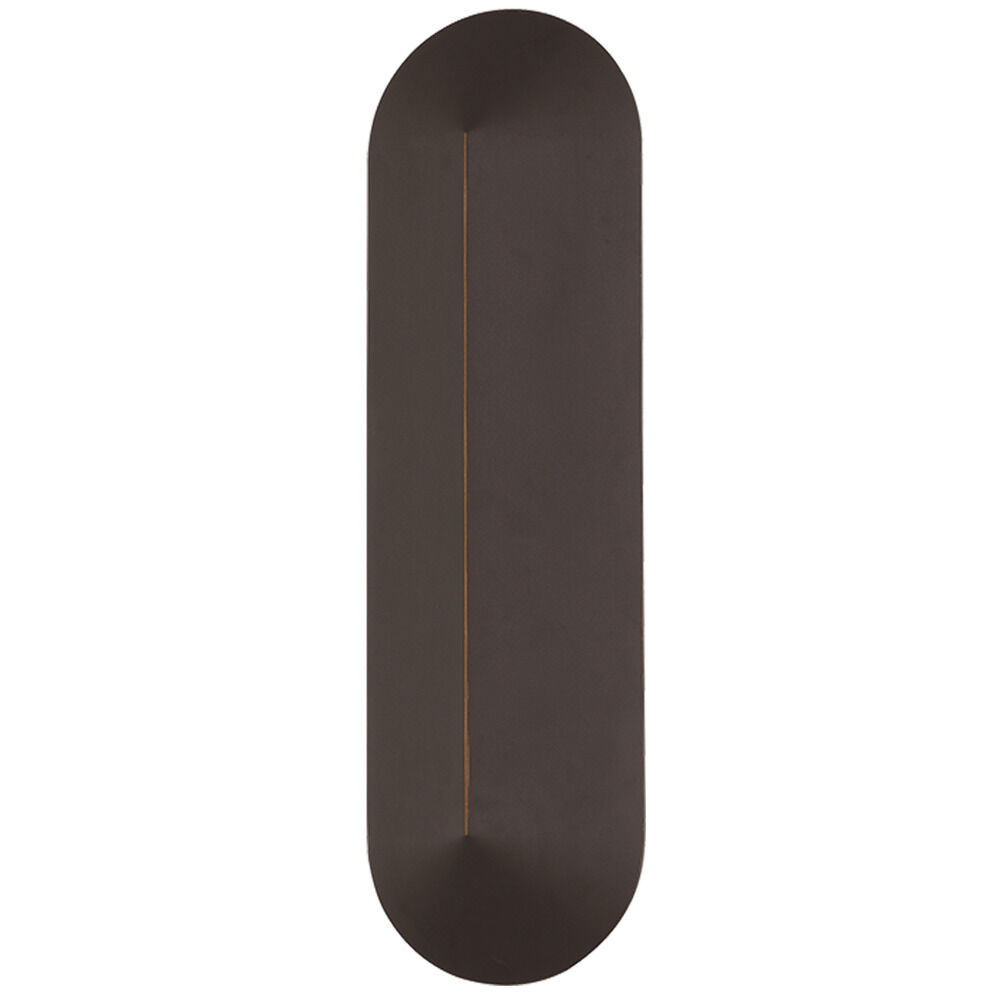 Adapting a modern, tapered racetrack design to an exterior sconce, Ronan is an ellipse of style and substance. The elongated, rounded shape is accented by a thin, raised centerline, revealing a warm coppery undertone beneath the Textured Bronze finish. The metal silhouette shields visibility of the canopy and LED strip, creating a warm wall wash that illuminates the dark nights.