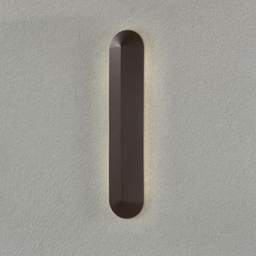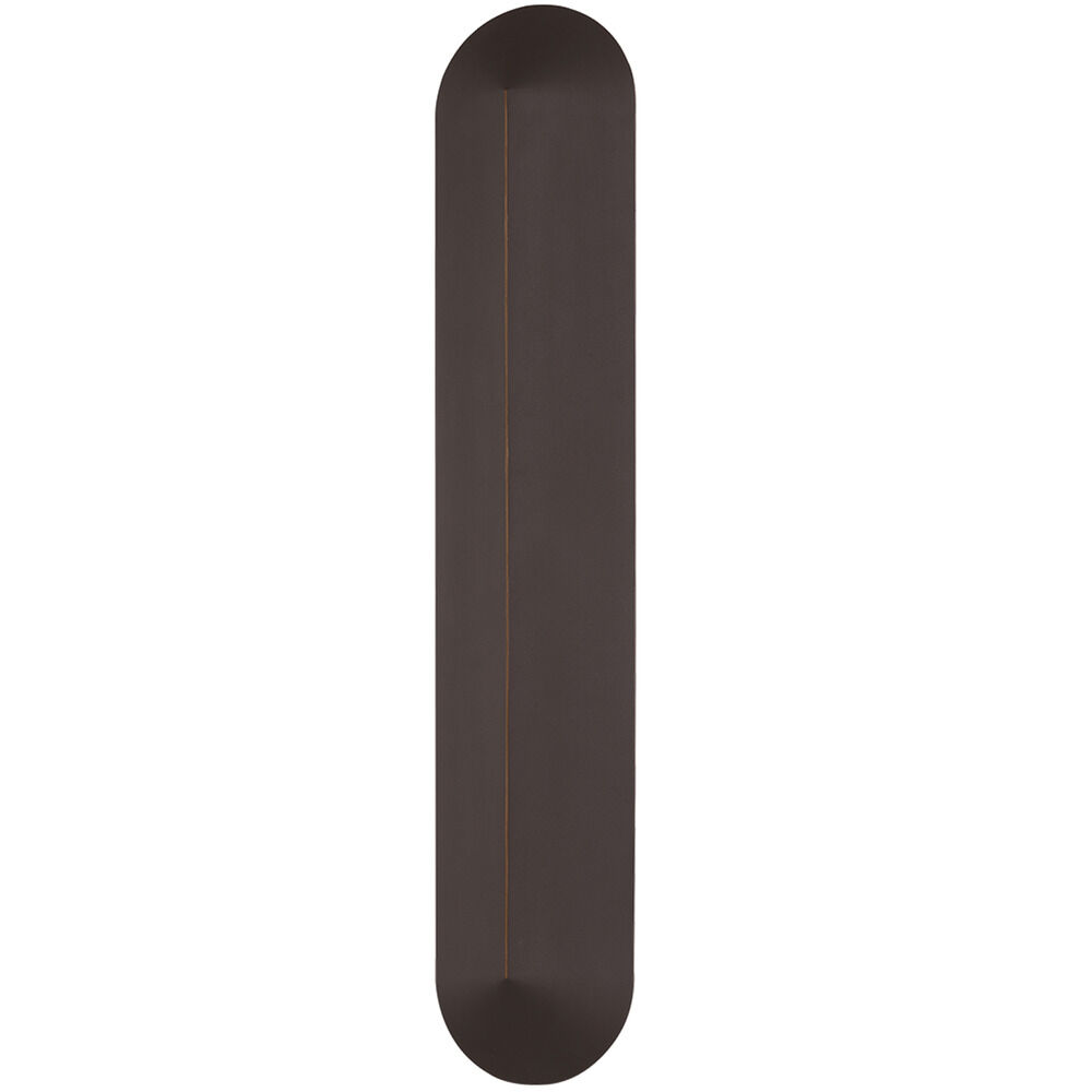 Adapting a modern, tapered racetrack design to an exterior sconce, Ronan is an ellipse of style and substance. The elongated, rounded shape is accented by a thin, raised centerline, revealing a warm coppery undertone beneath the Textured Bronze finish. The metal silhouette shields visibility of the canopy and LED strip, creating a warm wall wash that illuminates the dark nights.