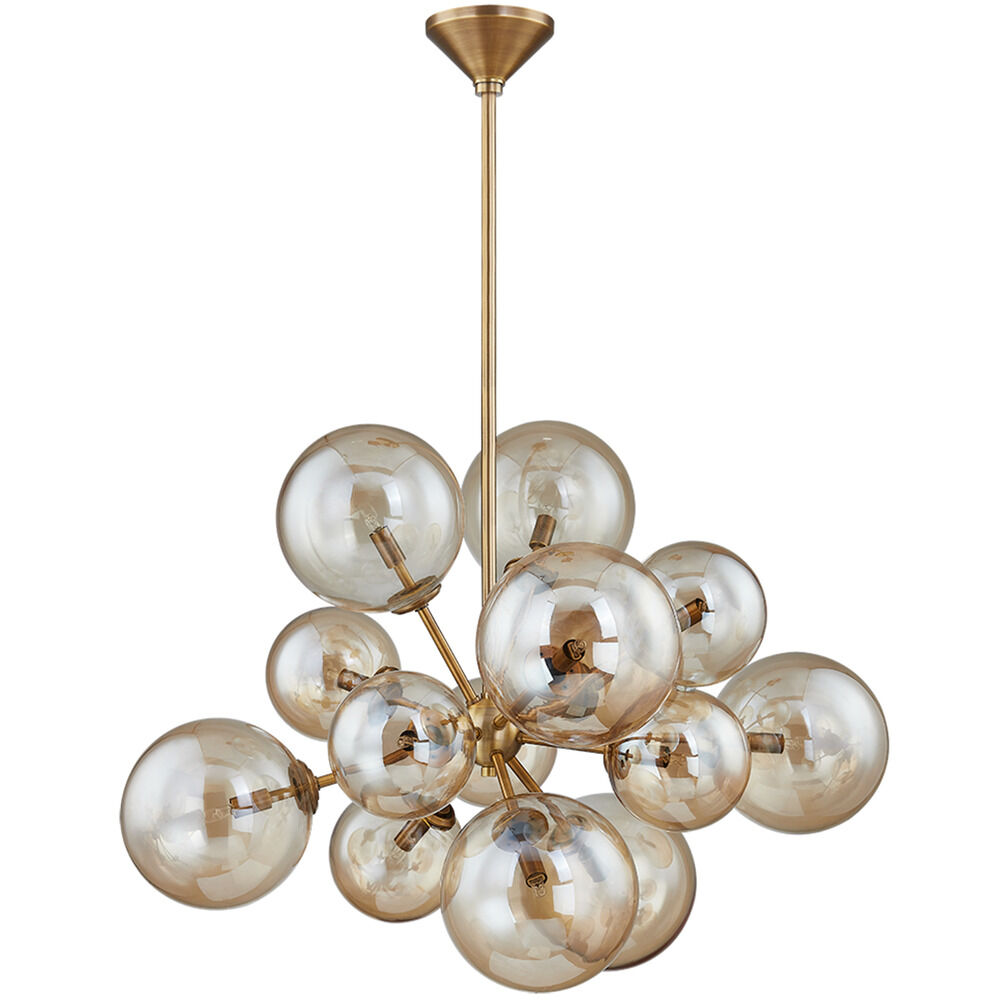 Glass globes in varying sizes burst from a center orb to form an irregular sputnik silhouette with an organic feel. The clear champagne glass pairs perfectly with the Patina Brass metalwork giving the chandelier an all-over golden glow. Santee brings warmth, energy, and a luxe look to ceilings throughout the home.