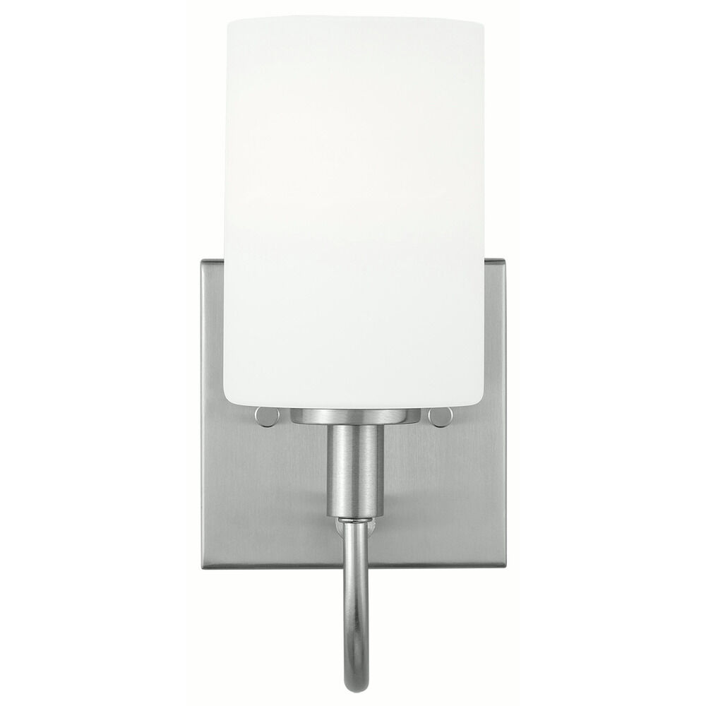 Transitional brushed nickel 1-light sconce with etched & white inside glass shade