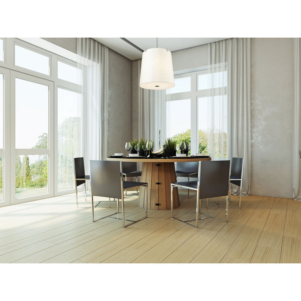 Transitional brushed nickel 6-light pendant light with cream fabric shade